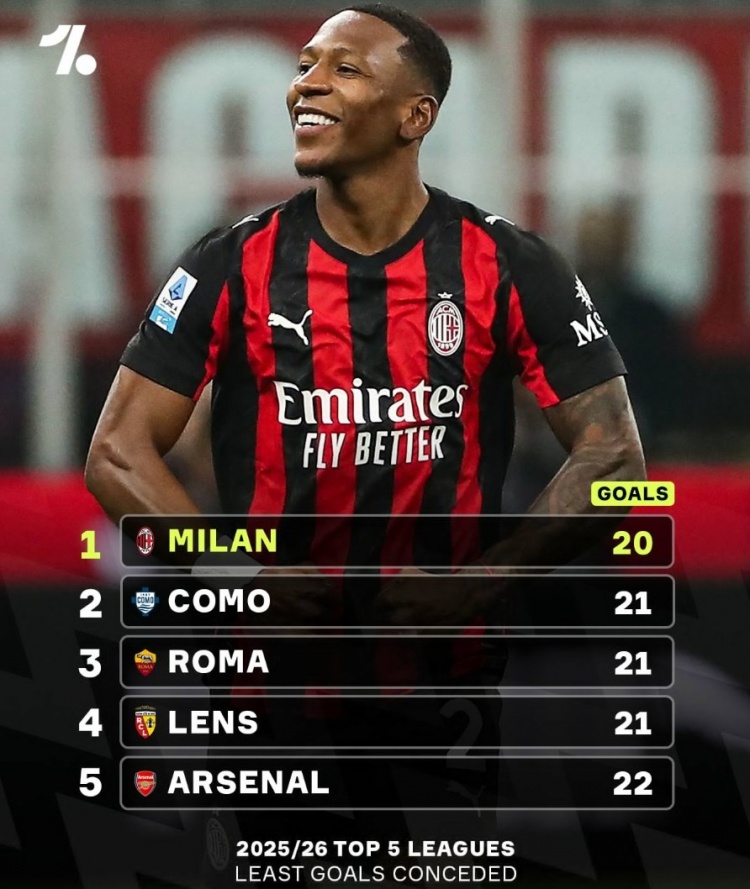 3月12日讯 在阿莱格里治下,米兰成为意甲防守最好的球队之一,在五大联赛也是如此。根据数据统计,米兰是本赛季五大联赛迄今为止丢球最少的球队,红黑军团仅丢了20球,位居其后的是科莫、罗马及朗斯的21球,阿森纳以22球位居第5。